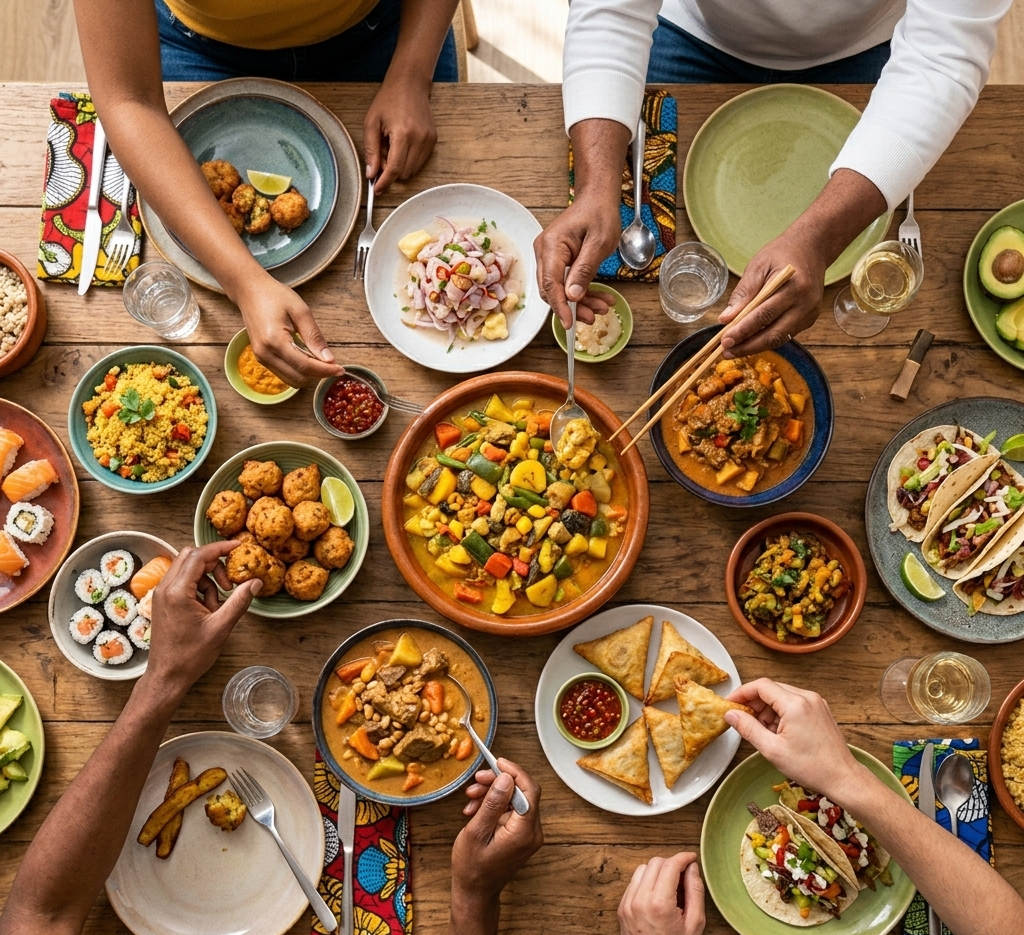 A group of people gathered around a table covered by a canopy situated in an urban neighborhood setting. They are engaged in conversation or community activities. The area has various houses and buildings with visible electric poles and wires overhead. Children and adults are present, some standing and others seated.