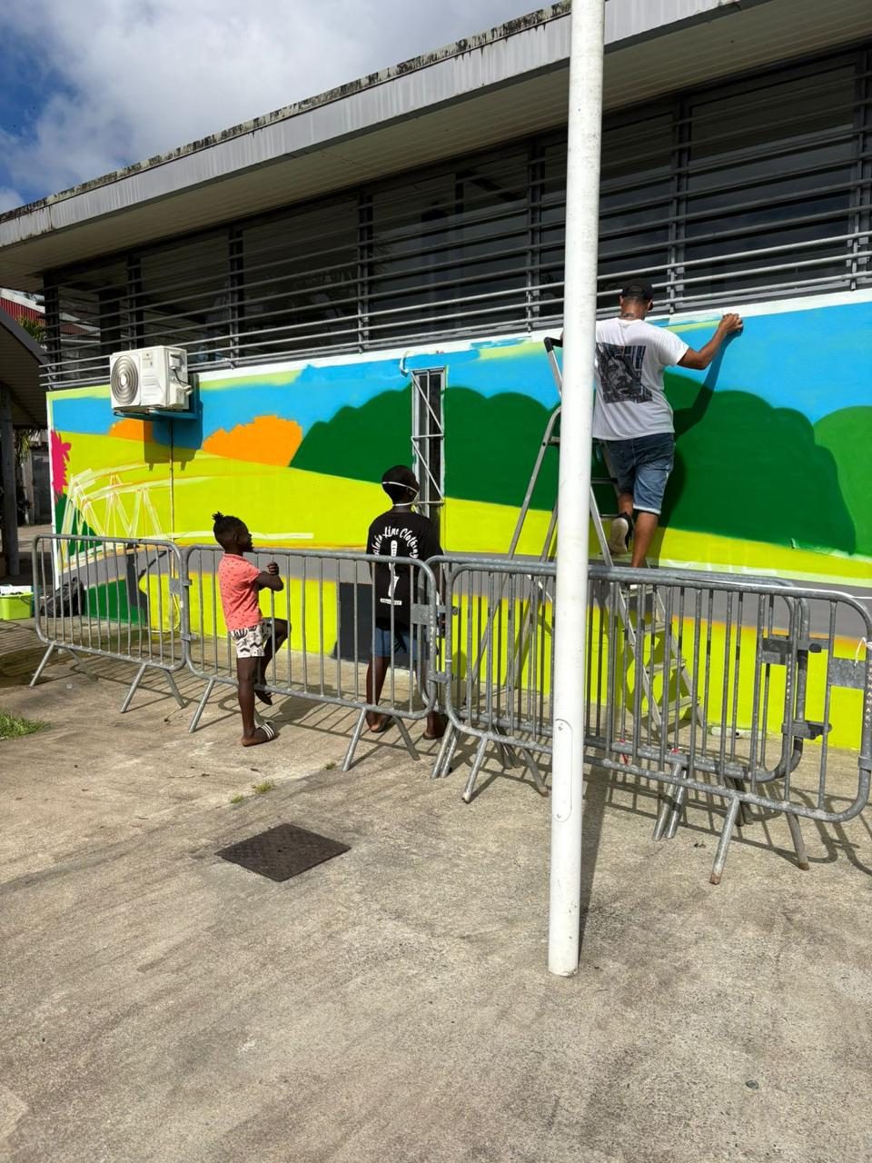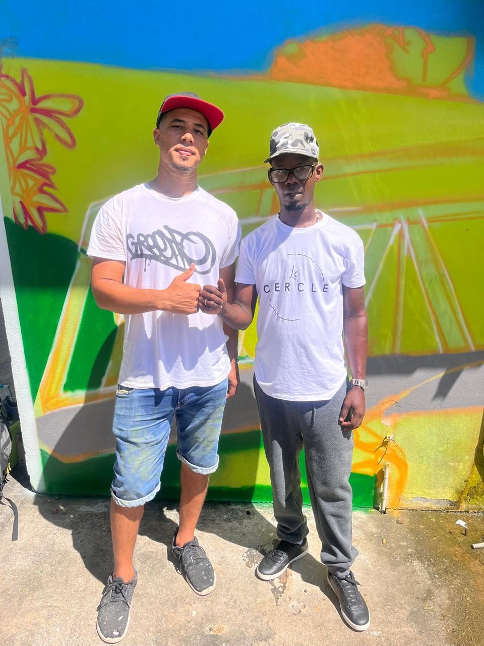 Greeffe, artiste graffeur reconnu pour ses fresques monumentales et son engagement auprès des jeunes, anime pour Le Cercle un atelier d’initiation au street art dans la ville de Sinnamary.